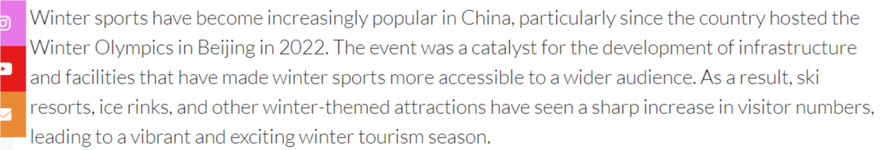文章說,自2022年北京冬奧會(huì)成功舉辦以來,冰雪運(yùn)動(dòng)在中國(guó)越來越受歡迎。冬奧效應(yīng)帶動(dòng)了基礎(chǔ)設(shè)施的完善,讓更多人得以接觸冰雪項(xiàng)目。如今,滑雪場(chǎng)、冰場(chǎng)和其他冬季主題景點(diǎn)客流量大幅增長(zhǎng),造就了充滿活力、令人興奮的冰雪旅游季。