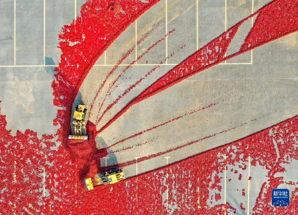 10月25日,在開魯縣東風(fēng)鎮(zhèn),工作人員駕駛鏟車收獲晾曬好的紅干椒(無(wú)人機(jī)照片)。新華社記者 連振 攝