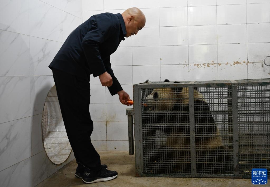 10月18日,在中國大熊貓保護研究中心雅安基地,飼養(yǎng)師董禮用胡蘿卜安撫進入轉(zhuǎn)運籠的大熊貓“四?!薄P氯A社記者 胥冰潔 攝