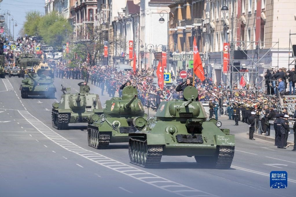 5月9日,在俄羅斯符拉迪沃斯托克市,坦克編隊參加閱兵式。新華社發(fā)(郭飛洲攝)