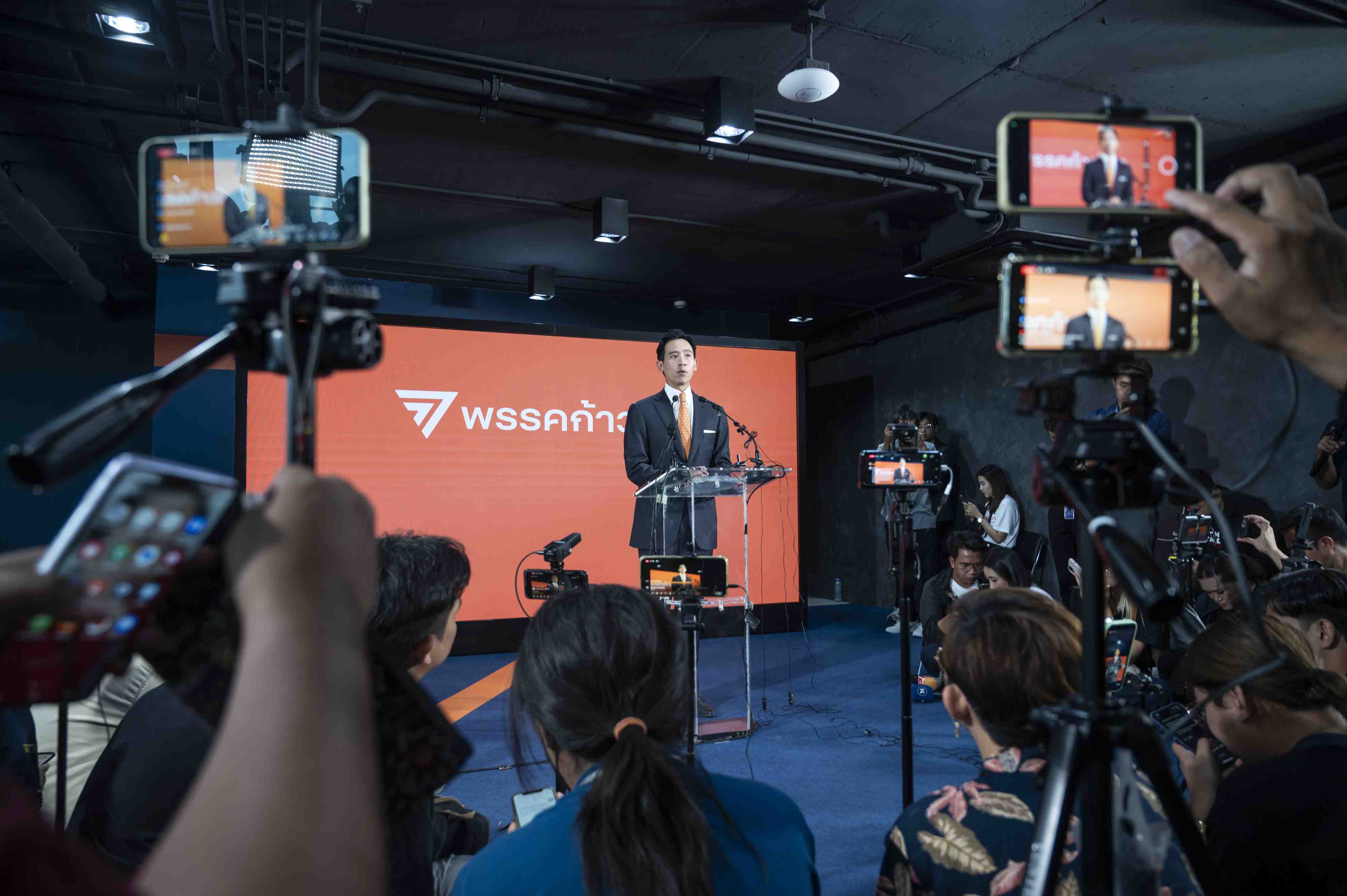 當(dāng)?shù)貢r(shí)間2023年5月15日,泰國曼谷,泰國遠(yuǎn)進(jìn)黨黨魁皮塔在該黨總部舉行記者招待會(huì)。當(dāng)日中午,在泰國國會(huì)下議院選舉中獲得選票數(shù)和下議院席位數(shù)暫時(shí)領(lǐng)先的遠(yuǎn)進(jìn)黨黨魁皮塔宣布遠(yuǎn)進(jìn)黨在此次選舉中獲勝,已經(jīng)做好組建新一屆政府的準(zhǔn)備,自己也已準(zhǔn)備好擔(dān)任總理一職。 視覺中國