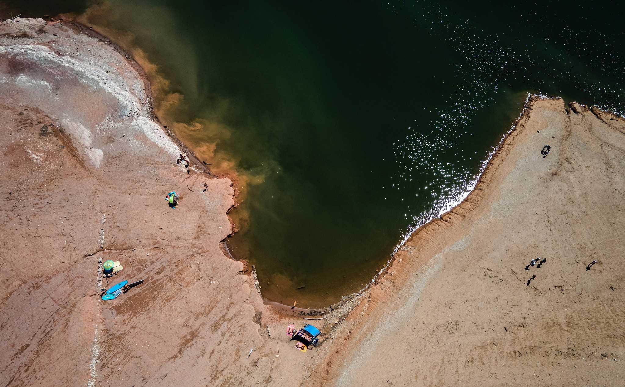 當(dāng)?shù)貢r間2023年4月16日,美國內(nèi)華達州,棕色的科羅拉多河流經(jīng)水位下降的米德湖。