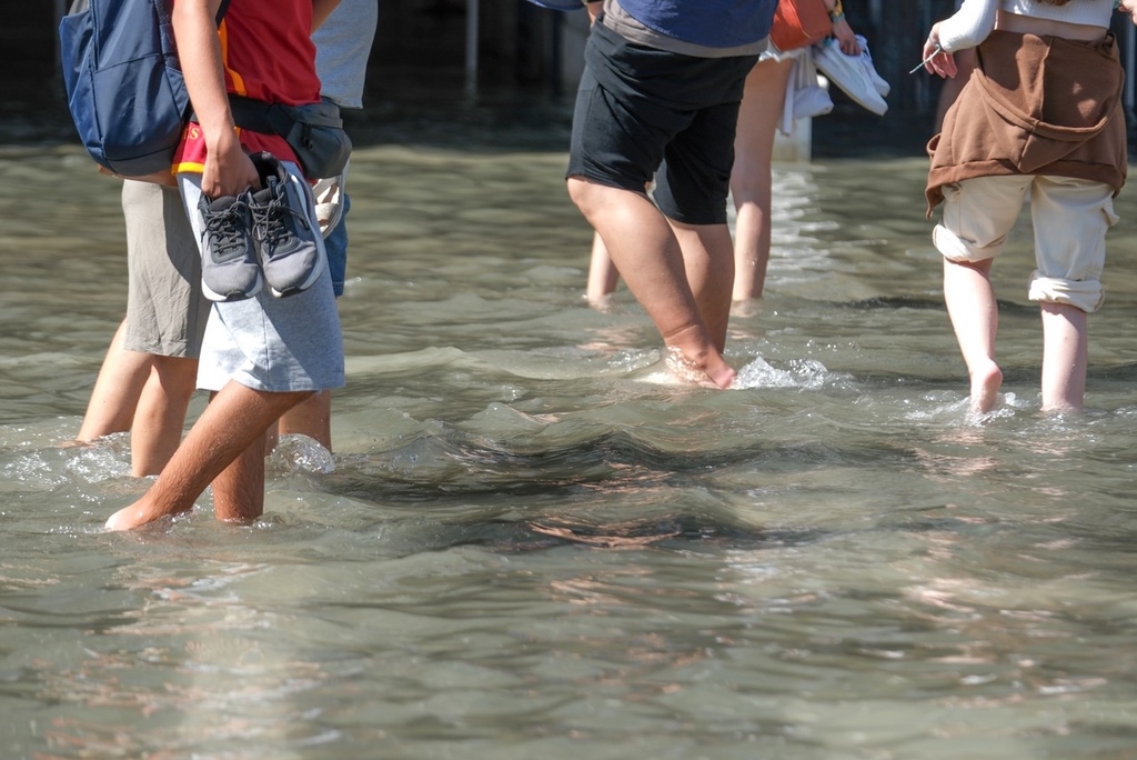 當?shù)貢r間2023年8月6日,意大利威尼斯,城內(nèi)部分地區(qū)積水嚴重,游客光腳走在水中。
