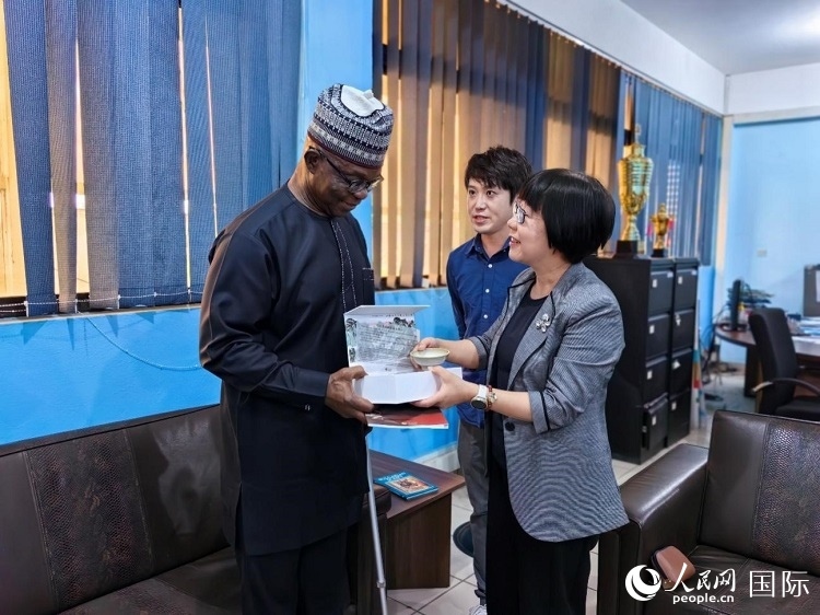 人民網(wǎng)監(jiān)事會(huì)主席唐維紅(右一)帶隊(duì)訪問(wèn)尼日利亞通訊社,與該社總裁布克·龐勒(左一)交流。人民網(wǎng)記者 陳星星攝