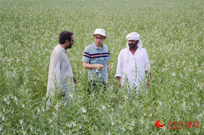 中巴經(jīng)濟(jì)走廊農(nóng)業(yè)合作中心負(fù)責(zé)人席建龍(中)與巴基斯坦當(dāng)?shù)剞r(nóng)戶在芝麻種植園交流作物生長情況。人民網(wǎng) 薩義德·邁赫迪攝