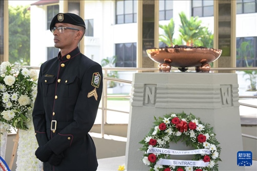 1月9日,在巴拿馬首都巴拿馬城,兩名士兵向紀(jì)念“護旗運動”的“永恒之火”紀(jì)念碑獻(xiàn)花圈。新華社記者 陳昊佺 攝