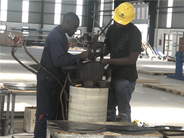經(jīng)貿(mào)合作區(qū)廠房內(nèi),當(dāng)?shù)毓と苏诰o張作業(yè)。人民網(wǎng)記者 黃培昭攝