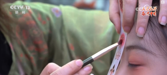 花鈿是古代女性在額頭部位點(diǎn)綴的一種花飾?,F(xiàn)在的胡芯銀,不僅會(huì)根據(jù)顧客的年齡、臉型和服裝的樣式來(lái)搭配不同風(fēng)格的花鈿,還會(huì)給小姐姐們做一些傳統(tǒng)文化的講解。胡芯銀說(shuō),要想做得更好,就要多看多學(xué)。