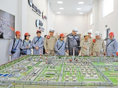 人民日報和哈薩克斯坦媒體“高質(zhì)量共建‘一帶一路’”聯(lián)合采訪團(tuán)隊近日來到哈薩克斯坦奇姆肯特市,采訪了奇姆肯特?zé)拸S現(xiàn)代化改造項目。圖為聯(lián)合采訪團(tuán)隊在奇姆肯特?zé)拸S沙盤前聽取情況介紹。本報記者 趙益普攝