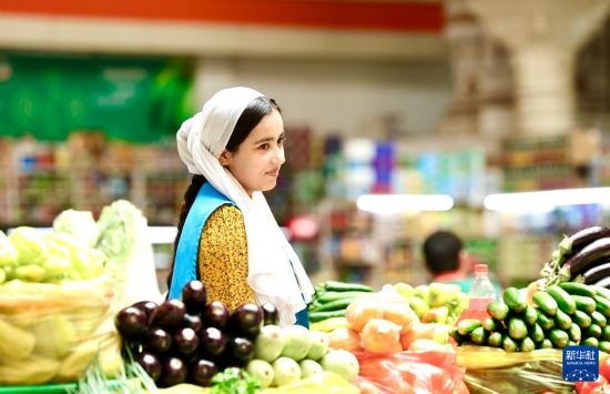 這是7月3日在塔吉克斯坦首都杜尚別大巴扎內(nèi)拍攝的營業(yè)者。新華社記者 姚大偉 攝