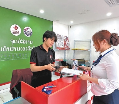 在老撾首都萬象市一處便民服務(wù)點(diǎn),當(dāng)?shù)鼐用袷杖≡陔娚唐脚_選購的商品快遞。本報(bào)記者 孫廣勇攝