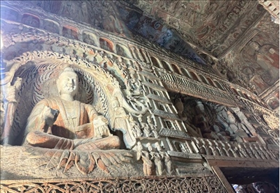 人民網(wǎng)北京9月2日電 (曹欣悅、鐘文興)“石窟的窟龕上有不同的造像,上面一層和古希臘藝術密切相關,這層的圖案其實是受到波斯文化的影響......”“佛身上隱約可以看到的蛇紋也是犍陀羅文化在石窟上的顯現(xiàn)?!彪S著工作人員的講解,這樣一部融合了絢麗的西域文化、雄渾的北疆文化、深厚的中原文化等多民族文化藝術史詩——云岡石窟,在各位參觀者眼前徐徐展開。