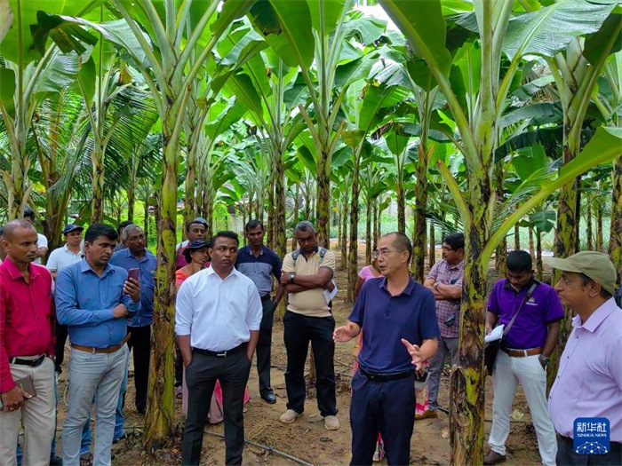 10月10日,在斯里蘭卡霍勒訥的一處香蕉示范基地,中國、聯(lián)合國糧農(nóng)組織與斯里蘭卡南南合作項(xiàng)目中國專家組組長孫德權(quán)為當(dāng)?shù)剞r(nóng)民進(jìn)行技術(shù)培訓(xùn)。新華社發(fā)(中國、聯(lián)合國糧農(nóng)組織與斯里蘭卡南南合作項(xiàng)目專家組供圖)