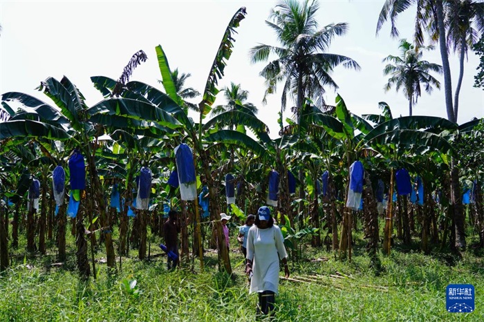12月23日,在斯里蘭卡馬坎杜拉,農(nóng)民走過中國技術(shù)試驗(yàn)田香蕉田。新華社記者 陳冬書 攝