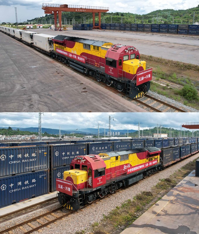 8月23日,準(zhǔn)備發(fā)車前往老撾萬(wàn)象的國(guó)際貨物列車停靠在中老鐵路玉溪研和站。