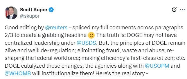 路透社還援引美國人事管理局局長庫珀的消息,稱“政府效率部”已“不存在”,并稱其已不再是一個“集中式機構(gòu)”。