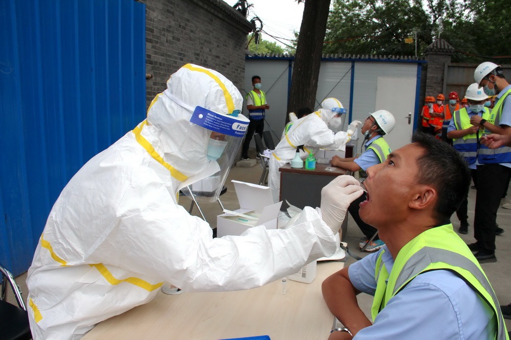 6月15日至17日,中建三局北京公司在京1042名職工做完核酸檢測,同時公司邀請專業(yè)機構為在建項目的上萬名勞務工人、安保及物業(yè)管理人員提供上門核酸檢測。新華社發(fā)(柯玉乾攝)
