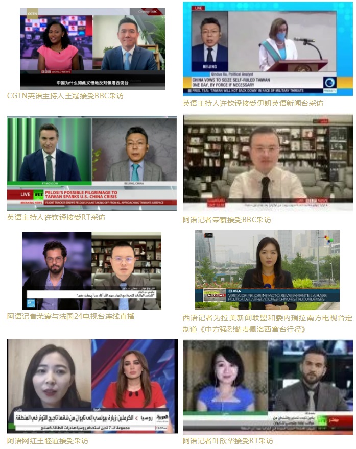 CGTN英、西、法、阿、俄等多語(yǔ)種主播、評(píng)論員和網(wǎng)紅積極在多家外媒發(fā)聲,接受了包括英國(guó)廣播公司(BBC)、今日俄羅斯(RT)、伊朗英語(yǔ)新聞臺(tái)(Press TV)、拉美新聞聯(lián)盟、貝寧E-TELE電視臺(tái)、法國(guó)24電視臺(tái)、沙特阿拉比亞電視臺(tái)以及以色列i24news電視臺(tái)等多家國(guó)際媒體的采訪(fǎng)連線(xiàn),主動(dòng)闡釋中方立場(chǎng),分析佩洛西這一挑釁行徑背后的虛偽動(dòng)因,揭批美國(guó)在臺(tái)灣問(wèn)題上“說(shuō)一套做一套”、侵犯中國(guó)的主權(quán)和領(lǐng)土完整的行為。