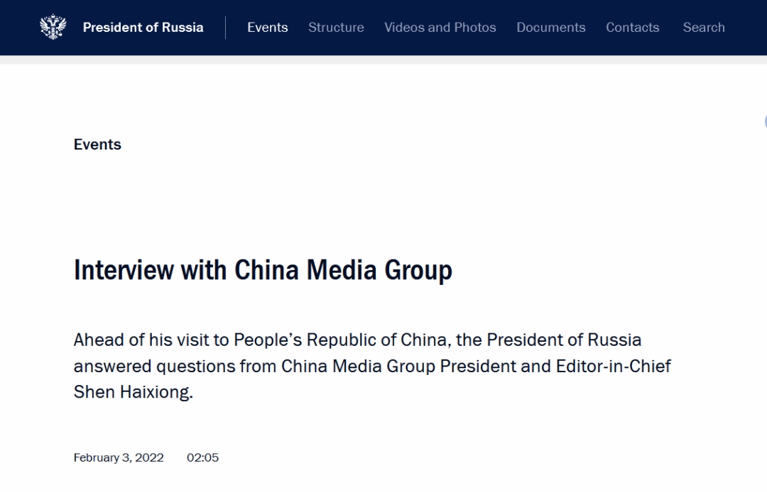 2022年2月3日,俄羅斯總統官網和中國國家通訊社、國家電視臺同步發(fā)布消息,在受邀出席北京冬奧會開幕式前夕,俄羅斯總統普京接受了中央廣播電視總臺臺長兼總編輯慎海雄的書面專訪。雖是書面采訪,但雙方的提問和回答的現場感相當強,且信息量大,不亞于2018年5月31日慎海雄在克里姆林宮獨家專訪普京的效果。