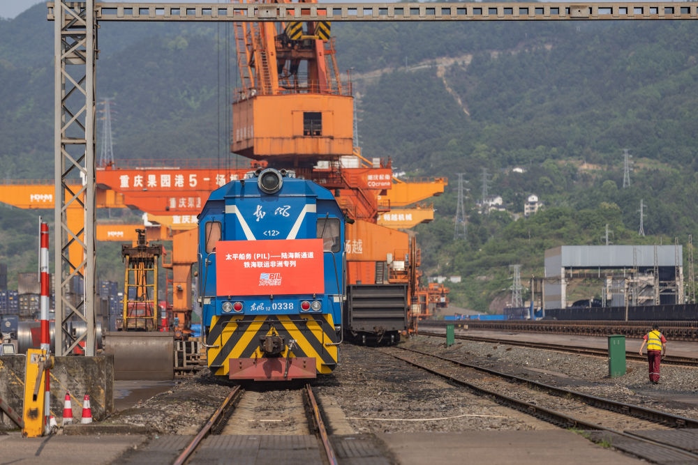 4月27日,太平船務(wù)——西部陸海新通道江鐵海聯(lián)運(yùn)非洲專列在重慶果園港魚嘴站等待發(fā)車。新華社記者 黃偉 攝
