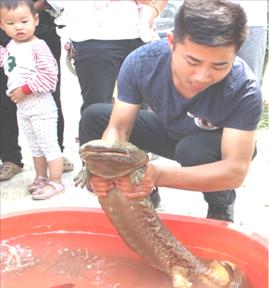 戴莊村民將野生娃娃魚送至野生動物保護站。受訪者供圖