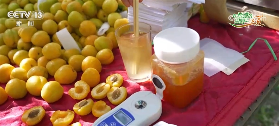 其實輪臺白杏在新疆本地也是非常有口碑的。大家知道嗎?輪臺白杏在當?shù)匾脖环Q作是“白色蜂蜜”,那它到底擔不擔得起這個稱號?我們今天在現(xiàn)場給大家?guī)砹艘粋€小的試驗,這是一杯白水加了三勺蜂蜜,可以看到它已經(jīng)是蜂蜜水的顏色了,我們通過測糖儀來測一下蜂蜜水的糖度,17度。那我們來測一下我們剛才嘗的這個輪臺白杏,擠一些它的汁液出來,16度,已經(jīng)非常接近蜂蜜水的甜度了。