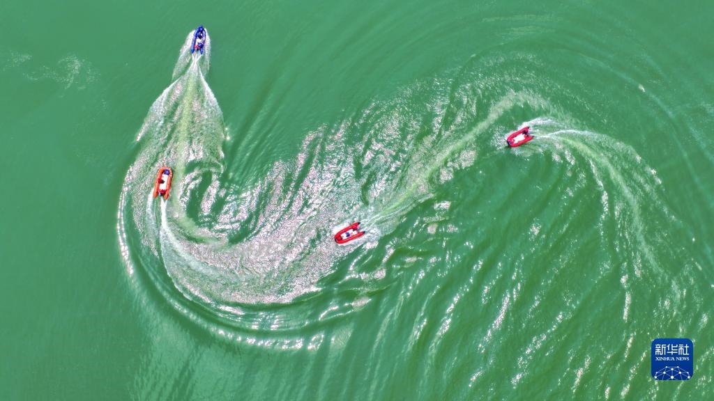 當日,在浙江省湖州市長興縣合溪水庫煤山段,煤山鎮(zhèn)組織黨員干部、應(yīng)急管理隊員、志愿者組成應(yīng)急救援隊,開展防汛減災(zāi)應(yīng)急綜合實戰(zhàn)演練,通過沖鋒舟編隊、水上打撈、水上救援等課目訓(xùn)練,增強防汛應(yīng)急處置和水上搶險救災(zāi)能力。新華社發(fā)(許旭 攝)