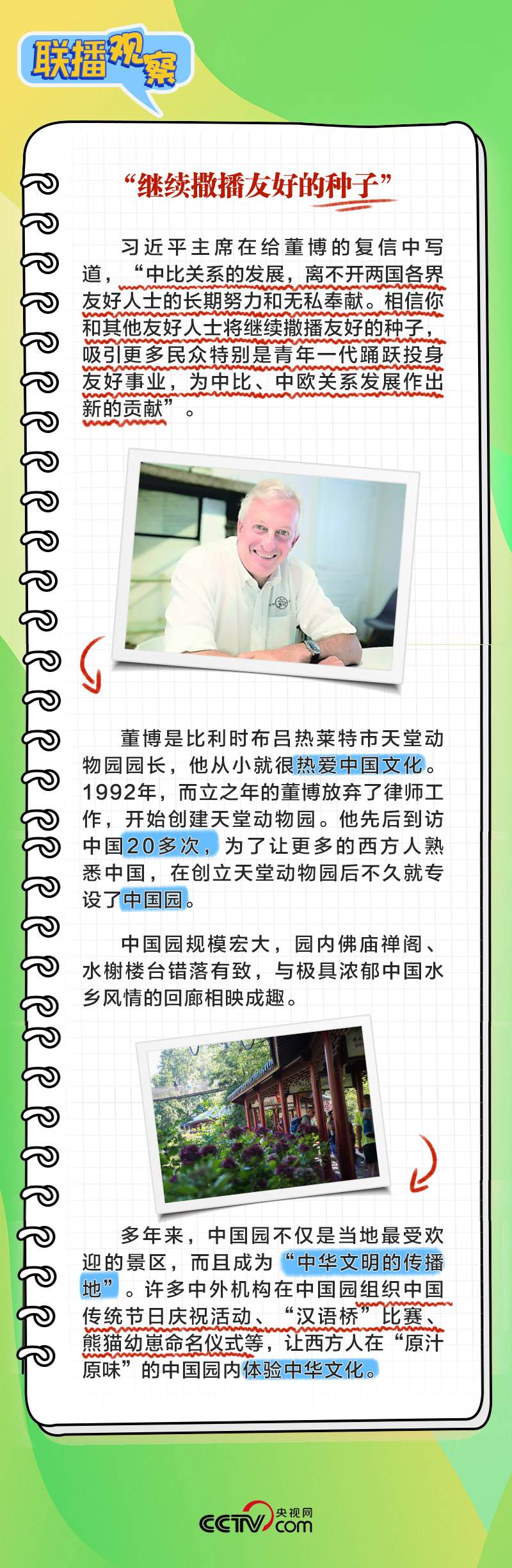 董博是比利時(shí)布呂熱萊特市天堂動(dòng)物園園長(zhǎng),他在給習(xí)主席致信中回顧了習(xí)主席和夫人彭麗媛2014年3月訪比期間出席天堂動(dòng)物園大熊貓園開園儀式的情景,表示中國園體現(xiàn)人與自然和諧共生理念,中國夢(mèng)和中國的發(fā)展繁榮永遠(yuǎn)是可共享的機(jī)遇。
