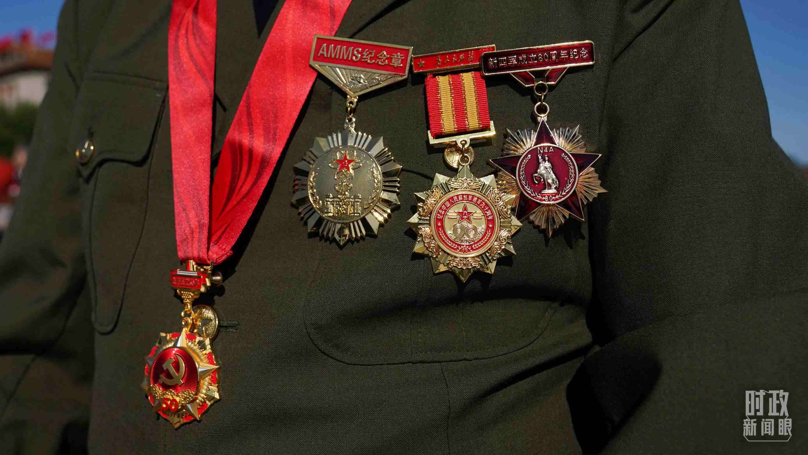 △儀式現(xiàn)場,老戰(zhàn)士代表身上佩戴多枚紀(jì)念章。(總臺國廣記者李晉拍攝)