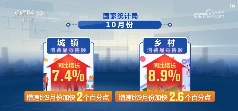 國家統(tǒng)計(jì)局最新數(shù)據(jù)顯示,在縣鄉(xiāng)消費(fèi)市場基礎(chǔ)設(shè)施不斷完善、有效供給持續(xù)擴(kuò)大等有利條件帶動(dòng)下,鄉(xiāng)村市場銷售增速快于城鎮(zhèn)。10月份,城鎮(zhèn)、鄉(xiāng)村消費(fèi)品零售額同比分別增長7.4%和8.9%,增速比9月份分別加快2和2.6個(gè)百分點(diǎn)。