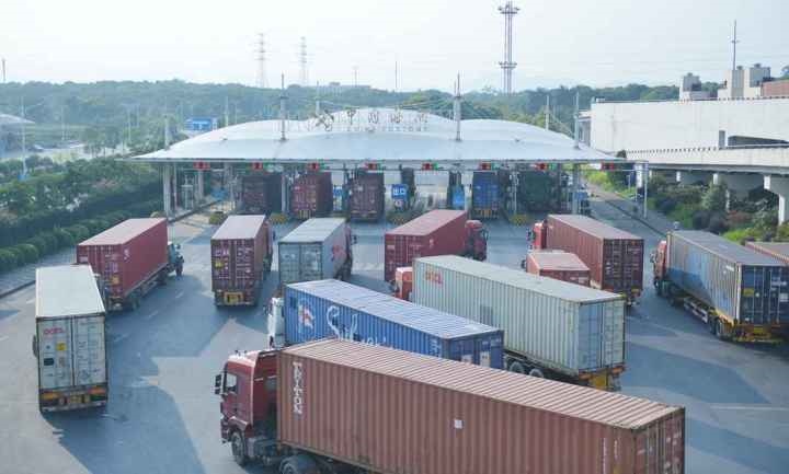 義烏海關(guān)排隊等待出關(guān)的車輛。共享聯(lián)盟·義烏 吳峰宇 攝