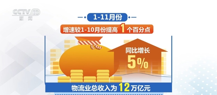 1—11月份,物流業(yè)總收入為12萬億元,同比增長5%,增速較1—10月份提高1個百分點。