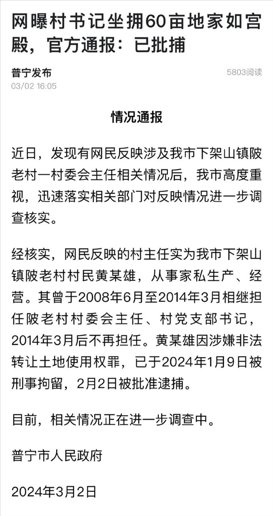 ·廣東普寧通報村支書坐擁60畝地:黃某雄因涉嫌非法轉(zhuǎn)讓土地使用權(quán)罪已被批準(zhǔn)逮捕。