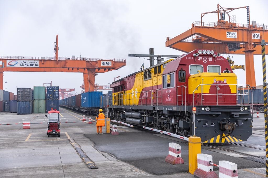 3月7日,一列滿載機(jī)械設(shè)備、整車及零部件等貨物的中歐班列在重慶團(tuán)結(jié)村中心站等候發(fā)車。新華社記者 黃偉 攝