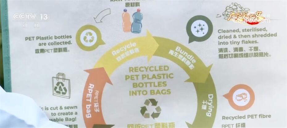 記者發(fā)現(xiàn)了一種用PET塑料瓶為原料制成的環(huán)保購物袋。PET簡稱聚酯,是一種常見的塑料材料,企業(yè)將這類塑料瓶回收后,經(jīng)過處理變成細(xì)小的瓶片,再經(jīng)融化和擠壓后變成纖維、織成布,最后就得到了一個(gè)可以循環(huán)使用的購物袋。