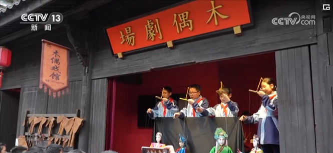 舞臺上,廿八都小學的同學們,一邊操縱木偶,一邊唱著臺詞,在非遺傳承人金宗懷的帶領下,正在演出他們最新排演的木偶戲。