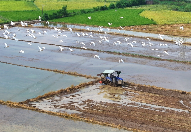 7月13日,湖南省衡陽市衡東縣霞流鎮(zhèn)農民駕駛農機翻耕稻田(無人機照片)。