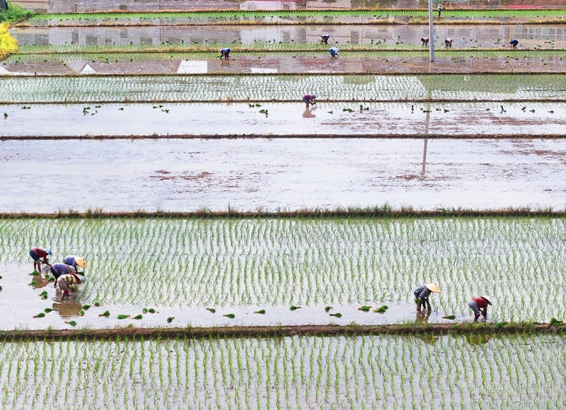 7月13日,湖南省衡陽市衡東縣霞流鎮(zhèn)農民在搶插晚稻(無人機照片)。
