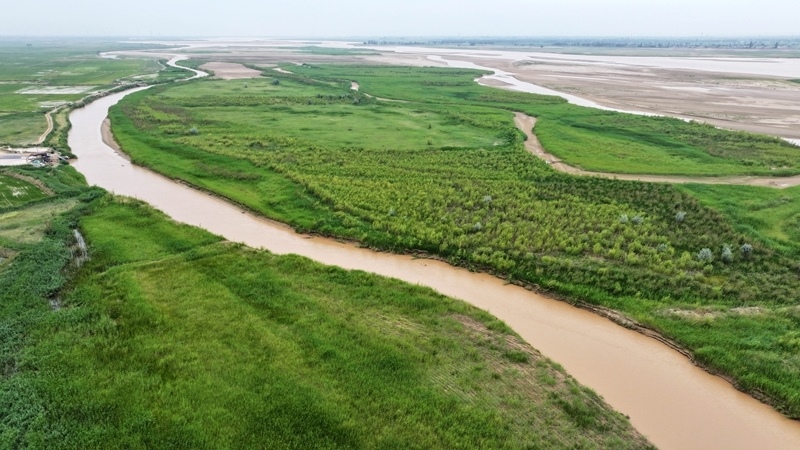 這是2025年6月22日在寧夏平羅縣境內(nèi)拍攝的黃河灘涂濕地(無(wú)人機(jī)照片)。新華社記者 王鵬 攝