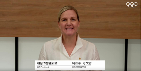 圖為國(guó)際奧委會(huì)主席考文垂發(fā)來視頻致辭(圖片來源:新華社)