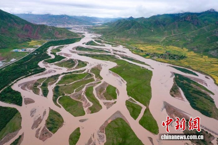 2023年8月22日,航拍青海省玉樹藏族自治州囊謙縣境內(nèi)的扎曲河網(wǎng)狀水系。扎曲河是瀾滄江上游主要干流之一,縱橫交錯(cuò)的河水在群山中蜿蜒流淌,形成獨(dú)特的高原河流景觀。中新社記者 馬銘言 攝
