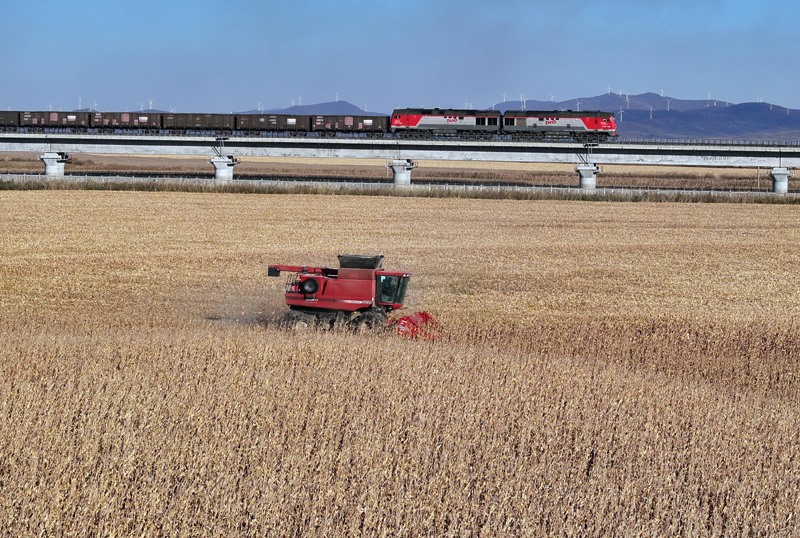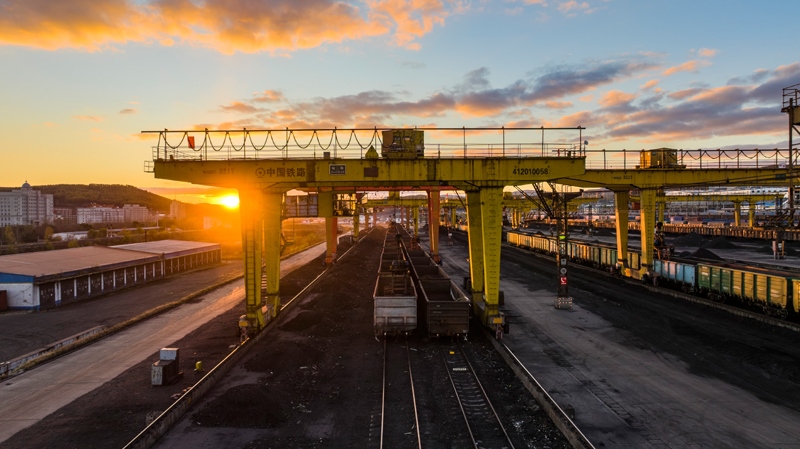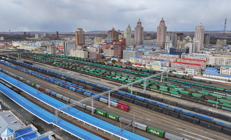 10月18日,一列滿載進(jìn)口物資的貨物列車駛向中國(guó)鐵路哈爾濱局集團(tuán)有限公司綏芬河站(無(wú)人機(jī)照片)。