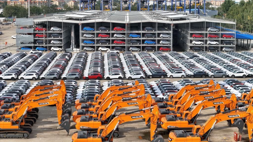 △山東港口煙臺(tái)港,國(guó)產(chǎn)汽車和工程機(jī)械集結(jié)等待裝船出口。