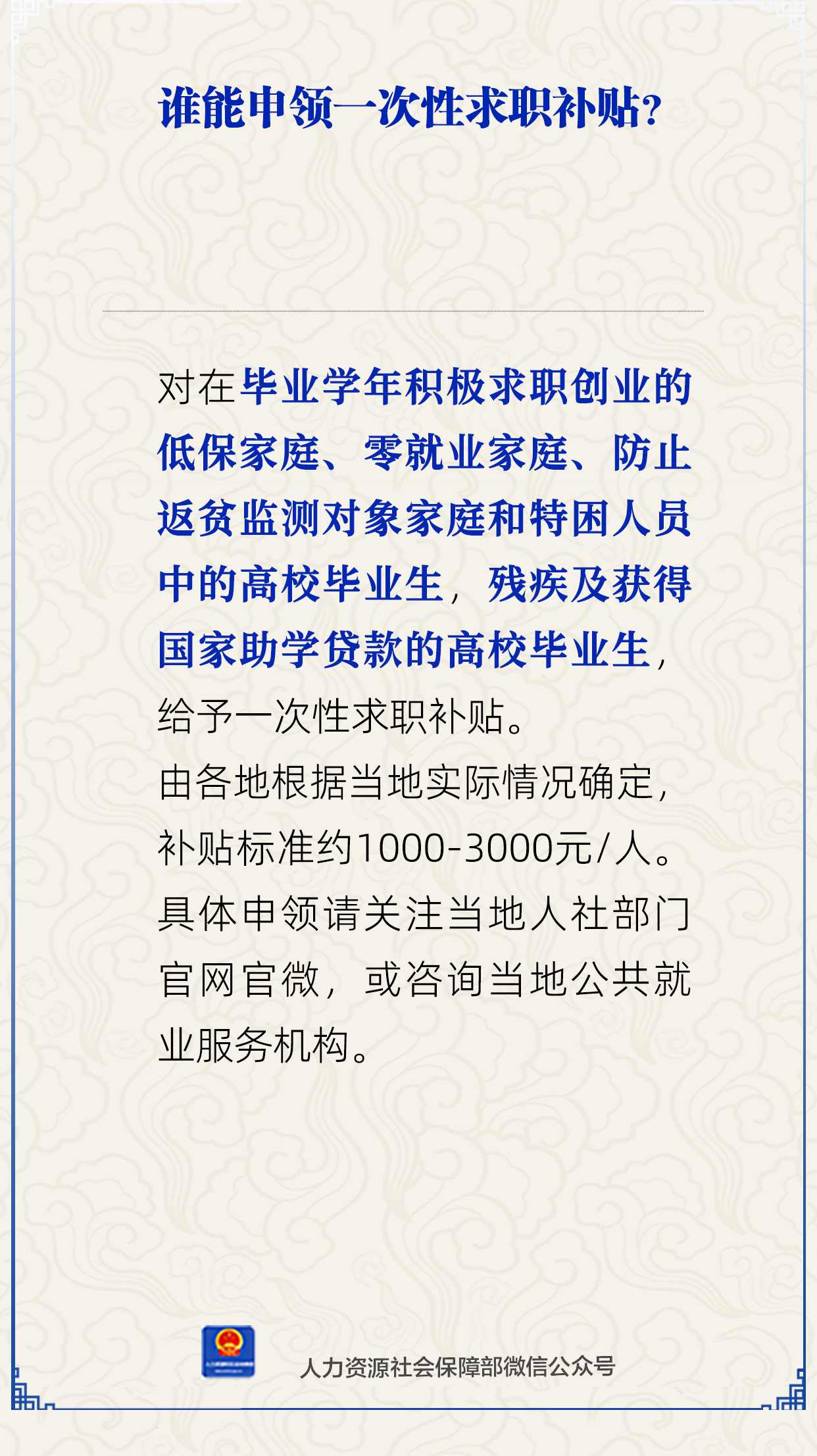 由各地根據(jù)當(dāng)?shù)貙?shí)際情況確定,補(bǔ)貼標(biāo)準(zhǔn)約1000-3000元/人。具體申領(lǐng)請關(guān)注當(dāng)?shù)厝松绮块T官網(wǎng)官微,或咨詢當(dāng)?shù)毓簿蜆I(yè)服務(wù)機(jī)構(gòu)。