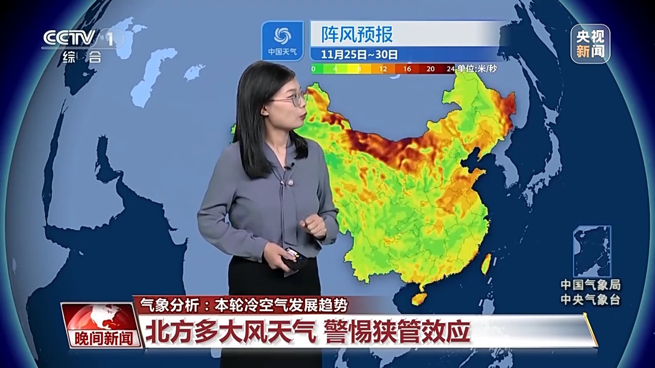 冷空氣帶來的大風比較頻繁,尤其是25日、26日以及29日前后,從西北到華北黃淮會陸續(xù)刮起5至7級的風,陣風可以達到8到9級,尤其是會出現狹管效應的區(qū)域,風力會更大。