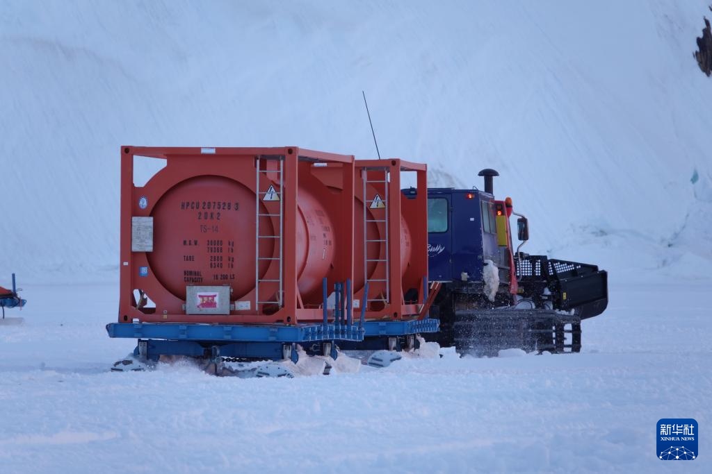北京時(shí)間12月3日凌晨,雪地車?yán)訚M燃油的油罐離開“雪龍2”號(hào),駛向中山站。新華社記者 顧天成 攝