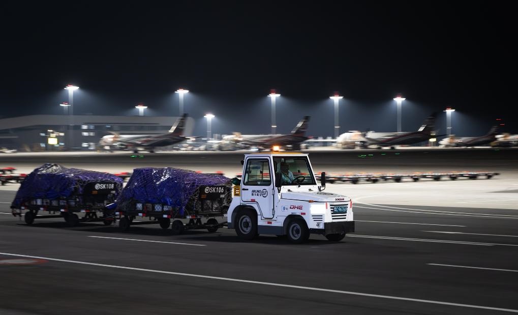 子夜時分,記者驅(qū)車來到這座機場時,撲面而來的是一派“不夜空港”的繁忙景象:雪亮的停機坪上,貨機剛一停穩(wěn),工作人員便操控牽引車、加油車、轉(zhuǎn)運車簇擁而上,卸貨、加油、檢查,井井有條,一刻也不耽誤。