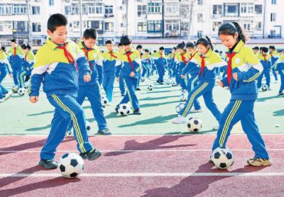 新學(xué)期伊始,河北省秦皇島市海港區(qū)耀華小學(xué)以足球素質(zhì)操等活動(dòng)結(jié)合十余種自主游戲項(xiàng)目,讓學(xué)生在趣味活動(dòng)中提升體能。圖為2月18日,學(xué)生在展示足球素質(zhì)操。