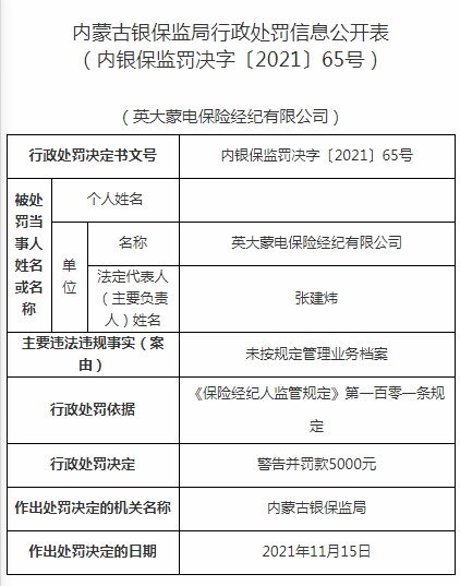 北疆新聞網(wǎng)、北疆新聞APP、北疆云消息(記者 張楊)12月10日,中國銀行保險(xiǎn)監(jiān)督管理委員會公布內(nèi)蒙古銀保監(jiān)局行政處罰信息公開表(內(nèi)銀保監(jiān)罰決字〔2021〕65號),英大蒙電保險(xiǎn)經(jīng)紀(jì)有限公司(以下簡稱“英大蒙電保險(xiǎn)”)因未按規(guī)定管理業(yè)務(wù)檔案,依據(jù)《保險(xiǎn)經(jīng)紀(jì)人監(jiān)管規(guī)定》第一百零一條規(guī)定,英大蒙電保險(xiǎn)被處以警告并罰款5000元。
