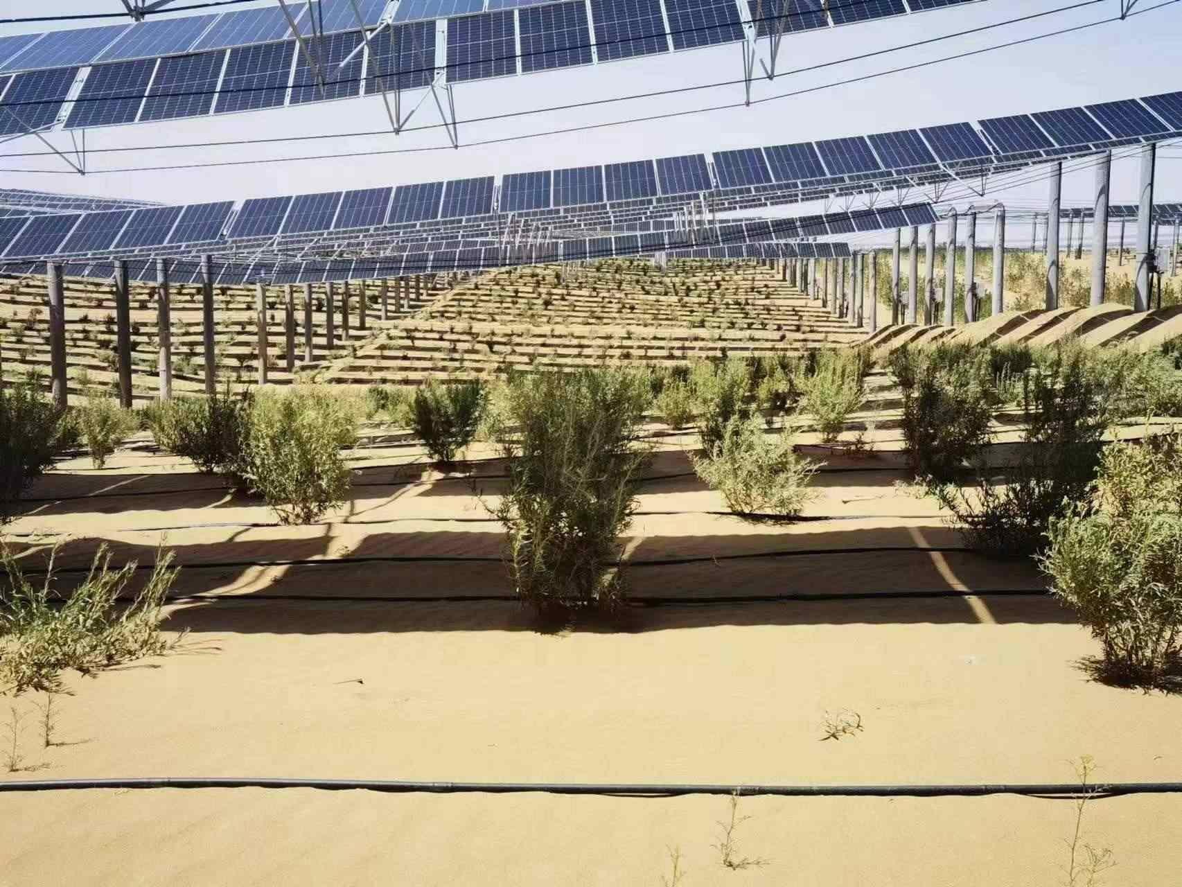 2021年,在“雙碳”戰(zhàn)略下,國(guó)家首批大型風(fēng)電光伏基地在我國(guó)西部沙區(qū)陸續(xù)開(kāi)工建設(shè)。甘肅省引進(jìn)億利立體生態(tài)光伏治沙模式和技術(shù),由億利潔能(600277)在甘肅武威投資建設(shè)50萬(wàn)千瓦立體生態(tài)光伏治沙產(chǎn)業(yè)化示范項(xiàng)目于當(dāng)年10月開(kāi)工建設(shè)。項(xiàng)目主要建設(shè)光伏電站、“農(nóng)光互補(bǔ)”種植試驗(yàn)區(qū)、“牧光互補(bǔ)”養(yǎng)殖區(qū)、生態(tài)修復(fù)牧草區(qū)和防風(fēng)林帶區(qū),這也是武威市實(shí)施的國(guó)家第一批以沙漠、戈壁、荒漠地區(qū)為重點(diǎn)的風(fēng)電光伏大基地項(xiàng)目。項(xiàng)目同時(shí)在光伏區(qū)周邊建設(shè)100米寬的防風(fēng)阻沙林帶,并種植60米寬的樟子松、花棒、檸條混交碳匯林,在項(xiàng)目主通道兩側(cè)種植20米寬的樟子松、花棒、檸條混交行道樹(shù),構(gòu)成光伏發(fā)電區(qū)域防止沙塵暴侵襲的第二道防線。在光伏板間建設(shè)養(yǎng)殖區(qū),發(fā)展生態(tài)雞、綿羊養(yǎng)殖。同時(shí)利用禽畜糞便改良土壤,增加土地肥力。將武威城區(qū)排放的3000萬(wàn)立方米/年的城市中水引入到光伏治沙園區(qū),在板下規(guī)劃高效節(jié)水農(nóng)業(yè),種植花棒、沙打旺、沙米、四翅濱藜等沙生植物2.1萬(wàn)畝,變荒漠為“綠地”,利用獨(dú)特的光伏產(chǎn)業(yè)產(chǎn)品吸引旅客,發(fā)展工業(yè)旅游,一產(chǎn)變多產(chǎn),形成了光伏治沙新模式,使沙漠“無(wú)人區(qū)”變成新的“淘金地”。